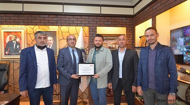 TÜRSAB Dumlupınar Bölgesel Yürütme Kurulu Başkanı Bilal Şenel ile Mustafa Memiş, Murat Sara ve Şükrü Deniz’den oluşan heyet Başkan Mustafa Çöl’e, 2-5 Nisan 2021 tarihlerinde “Turizmin Kalbi Gizemli Şehir Afyon’da Atıyor” sloganıyla gerçekleştirdiğimiz info programına verdiği desteklerden dolayı bir teşekkür plaketi takdim ettiler.