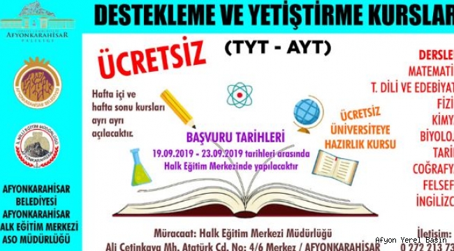 Afyonkarahisar Belediyesi ve Halk Eğitim Merkezi Akşam Sanat Okulu işbirliğinde düzenlenecek üniversite hazırlık destekleme ve yetiştirme kursları için müracaatlar başladı. Üniversiteye hazırlanacak gençlere Temel Yeterlilik ve Alan Yeterlilik testlerinde kendilerini geliştirme imkanı sağlayacak kurslarda, öğrencilere ücretsiz olarak; Matematik, Türk Dili ve Edebiyatı, Fizik, Kimya, Biyoloji, Tarih, Coğrafya, Felsefe ve İngilizce dersleri verilecek. Hafta içi ve hafta sonu ayrı ayrı açılacak kurs için müracaatlar, 23 Eylül tarihine kadar Halk Eğitim Merkezi Müdürlüğü'ne yapılabilecek.