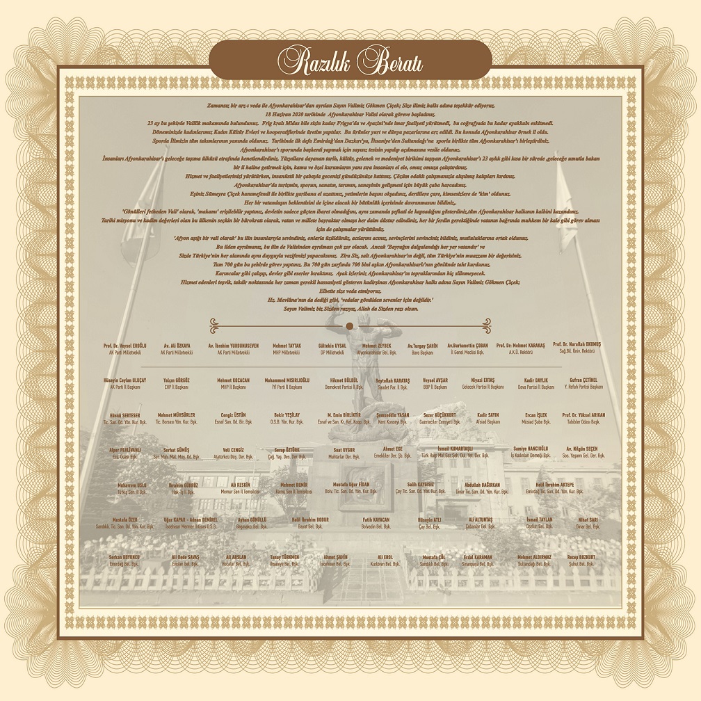 Kayseri Valiliği görevine atanan Gökmen Çiçek için Afyonkarahisar Gazeteciler Cemiyeti tarafından özel olarak hazırlanan “Razılık Beratı” cemiyet yönetim kurulu üyeleri tarafından Vali Çiçek’e verildi