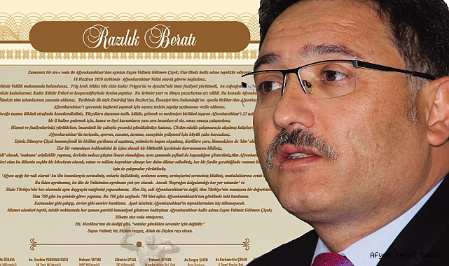Kayseri Valiliği görevine atanan Gökmen Çiçek için Afyonkarahisar Gazeteciler Cemiyeti tarafından özel olarak hazırlanan “Razılık Beratı” cemiyet yönetim kurulu üyeleri tarafından Vali Çiçek’e verildi. Vali Gökmen Çiçek, dualar, gözyaşları ve sevgi seli ile tayin olduğu Kayseri’ye dün sabah uğurlandı. Vali Gökmen Çiçek için Afyonkarahisar Gazeteciler Cemiyeti (AGC) yönetim kurulu üyeleri tarafından özel olarak hazırlanan “Razılık Beratı” cemiyet yönetimi tarafından Vali Çiçek’e uğurlama töreninde verildi. Razılık Beratı’nda; "Afyonkarahisar’da Ak Parti Milletvekili Prof.Dr Veysel Eroğlu, Ak Parti Milletvekili Ali Özkaya, Ak Parti Milletvekili İbrahim Yurdunuseven, MHP Milletvekili Mehmet Taytak, DP Milletvekili Gültekin Uysal, Afyon Belediye Başkanı Mehmet Zeybek, Baro Başkanı Turgay Şahin, İGM Başkanı Burhanettin Çoban, AKÜ Rektörü Prof. Dr. Mehmet Karakaş, AFSÜ Rektörü Prof. Dr. Nurullah Okumuş, Ak Parti İl Başkanı Hüseyin Ceylan Uluçay, CHP İl Başkanı Yalçın Görgöz, MHP İl Başkanı Mehmet Kocacan, İyi Parti İl Başkanı Muhammet Mısırlıoğlu, DP İl Başkanı Hikmet Bülbül, SP Partisi İl Başkanı Beytullah Karataş, BBP İl Başkanı Veysel Avşar, Gelecek Partisi İl Başkanı Niyazi Ertaş, DEVA Partisi İl Başkanı Kadir Daylık, Y.Refah Partisi İl Başkanı Gufran Çetinel, ATSO Başkanı Hüsnü Serteser, Tic. Borası Başkanı Mehemet Mühsürler, Esnaf Odası Birliği Başkanı Cengiz Üstün, OSB Başkanı Bekir Yeşilay, Esnaf ve Sanatkarlar Kredi ve kefalet Kooparatifi Başkanı M. Emin Birliktir, Kent Konseyi Başkanı Şemseddin Yasan, Gazeteciler Cemiyeti Başkanı Sezerküçükkurt, AFSİAD Başkanı Kadir Sayın, MÜSİAD Başkanı Ercan İşlek, Tabibler Odası Başkanı Prof. Dr. Yüksel Arıkan, Eczacılar Odası Başkanı Alper Pehlivanlı, Ser. Muh. Mal, Müş. Odası Başkanı Serhat Gümüş, Atatürkçü Düş. Der. Başkanı Veli Cengiz, Çağ. Yaş. Des. Der. Başkanı Serap Öztürk, Muhtarlar Der. Başkanı Suat Uygur, Emekliler Der. Başkanı Ahmet Ege, Türk.Harp Mal. Gaz.Şeh. Dul. Yet. Der. Başkanı İsmail Kumartaşlı, İş Kadın. Derneği Başkanı Samiye Hancıoğlu, Sos. Yaş. Gel. Derneği Başkanı Nilgün Seçen, Türkiş-Sen İl Başkanı Muharrem Uslu, Hak-İş İl Başkanı İbrahim Gürbüz, Memur-Sen İl Temsilcisi Ali Keskin, Kamu-Sen İl Temsilcisi Mehmet Demir, Bolv. Tic. San. Od Yön. Kurulu Başkanı Mustafa Uğur Fidan, ÇAY TSO Başkanı Salih Kaygısız, Dinar TSO Başkanı Abdullah Bağırkan, Emirdağ TSO Başkanı Halil İbrahim Aktepe, Sandıklı TSO Başkanı Mustafa Özer, İscehisar Mermer İhtisas O.S.B Uğur Kapar-Adnan Demirel, Başmakçı Belediye Başkanı Ayhan Gönüllü, Bayat Belediye Başkanı H. İbrahim Bodur, Bolvadin Belediye Başkanı Fatih Kayacan, Çay Belediye Başkanı Hüseyin Atlı, Çobanlar Belediye Başkanı Ali Altuntaş, Dazkırı Belediye Başkanı İsmail Taylan, Dinar Belediye Başkanı Nihat Sarı, Emirdağ Belediye Başkanı Serkan Koyuncu, Evciler Belediye Başkanı Ali Dede Savaş, Hocalar Belediye Başkanı Ali Arslan, İhsaniye Belediye Başkanı Tunay Türkmen, İscehisar Belediye Başkanı Ahmet Şahin, Kızılören Belediye Başkanı Ali Erol, Sandıklı Belediye Başkanı Mustafa Çöl, Sinanpaşa Belediye Başkanı Erdal Karaman, Sultandağı Belediye Başkanı Mehmet Aldırmaz, Şuhut Belediye Başkanı Recep Bozkurt olarak imzasını atan isimler oldu.Vali Gökmen Çiçek, gizemli şehir Afyonkarahisar’ın vefanın da şehri olduğunu söyleyerek şehir halkını şahsına gösterdiği ahde vefaya teşekkür etti.