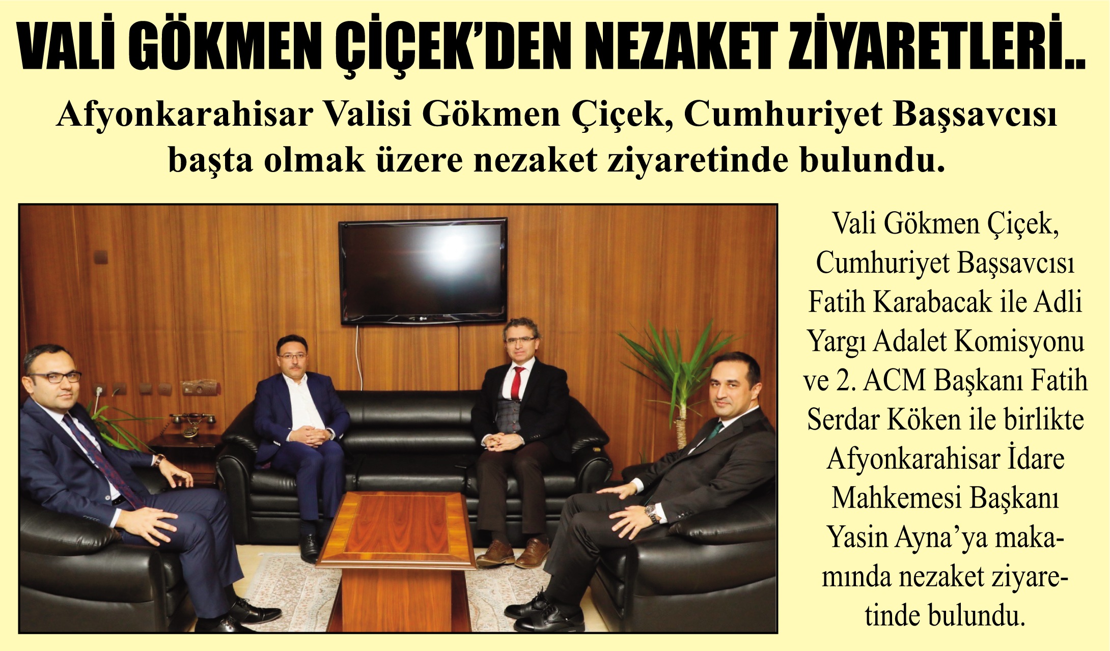 Vali Gökmen Çiçek, Cumhuriyet Başsavcısı Fatih Karabacak ile Adli Yargı Adalet Komisyonu ve 2. ACM Başkanı Fatih Serdar Köken ile birlikte Afyonkarahisar İdare Mahkemesi Başkanı Yasin Ayna’ya makamında nezaket ziyaretinde bulundu.