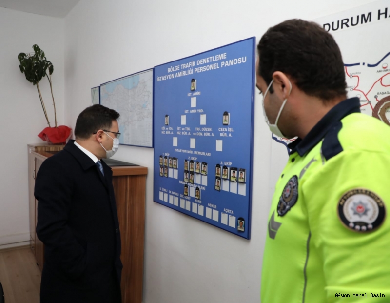 Valimiz Gökmen Çiçek sonrasında, Sandıklı Bölge Trafik Denetleme İstasyon Amirliğini ziyaret ederek denetim ve incelemelerde bulundu. İstasyon amirinden bilgiler alan Valimiz Gökmen Çiçek, özverili çalışmalarından dolayı personele teşekkür etti.