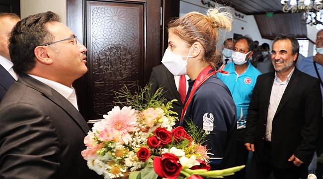 Milli sporcumuz Meryem Betül Çavdar’ı çiçekle karşılayan Vali Gökmen Çiçek: “İlimize, ülkemize yaşattığın gurur ve mutluluk için seni kutluyorum. Başarıların daim olsun “ dedi.