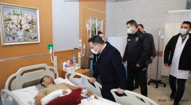 Vali Gökmen Çiçek, Sultandağı ilçesinde göreve giderken yaşanan elim kaza sonucu yaralanan Jandarma Uzman Çavuş Veli Bayer’i tedavi gördüğü Afyonkarahisar Sağlık Bilimleri Üniversitesi Hastanesi’nde ziyaret etti.
