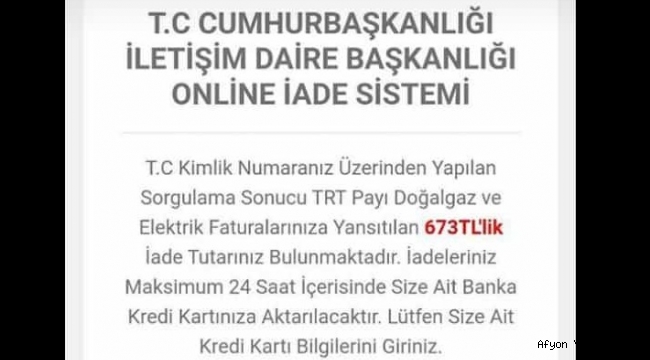 Söz konusu siteye erişimin engellenmesi, sorumluların adalet önünde hesap vermesiyle ilgili gerekli işlemler gerçekleştirilmiştir. Kurumlarımızın isimleri ve logoları kullanılarak hazırlanan sahtecilik girişimleri ile ilgili vatandaşlarımızı dikkatli olmaya çağırıyoruz. Herhangi bir mağduriyet yaşanmaması için aldatıcı yöntemlerle kredi kartı veya kişisel bilgileri isteyen site ve uygulamalara itibar edilmemesi gerekmektedir. İletişim Başkanlığı, vatandaşlardan hiçbir şekilde kredi kartı bilgilerini talep etmez. Kurumumuzun adı ve logosu ile yayılan “elektrik ve doğal gaz fatura iadesi” bildirimi, dolandırıcıların milletimizin devletimize olan güvenini kötüye kullanma girişimidir.