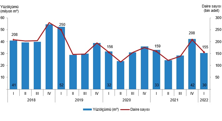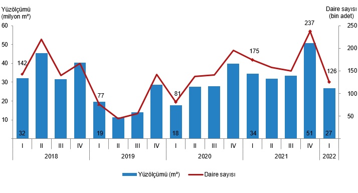 Belediyeler tarafından 2022 yılı I. çeyreğinde yapı kullanma izin belgesi verilen yapıların toplam yüzölçümü 30,4 milyon m² iken; bunun 17,7 milyon m²'si konut, 6,0 milyon m²'si konut dışı ve 6,7 milyon m²'si ise ortak kullanım alanı olarak gerçekleşti.