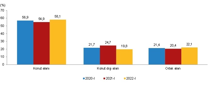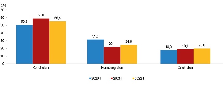 Yapı ruhsatı verilen yapılarda, konut, konut dışı ve ortak alanların yüzölçüm payları, I. Çeyrek, 2020-2022
