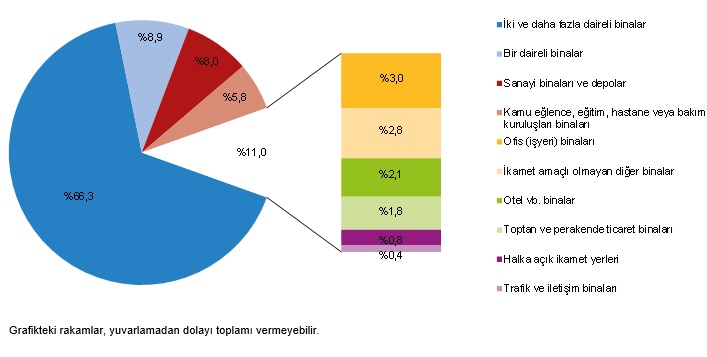 Kullanma amacına göre en yüksek pay %66,3 ile iki ve daha fazla daireli binaların oldu