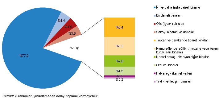 Kullanma amacına göre en yüksek pay %77,0 ile iki ve daha fazla daireli binaların oldu