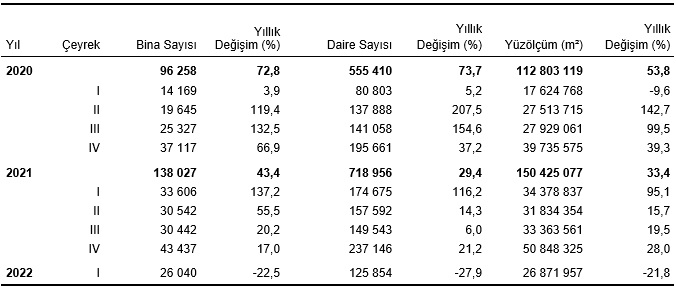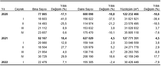 Bir önceki yılın aynı çeyreğine göre, 2022 yılı I. çeyreğinde belediyeler tarafından yapı kullanma izin belgesi verilen yapıların bina sayısı %7,1 artarken, daire sayısı %2,4, ve yüzölçümü %7,9 azaldı.