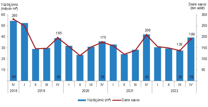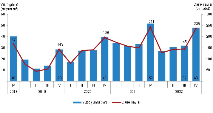 Belediyeler tarafından 2022 yılı IV. çeyreğinde yapı kullanma izin belgesi verilen yapıların toplam yüzölçümü 39,4 milyon m² iken; bunun 22,2 milyon m²'si konut, 9,3 milyon m²'si konut dışı ve 7,9 milyon m²'si ise ortak kullanım alanı olarak gerçekleşti.