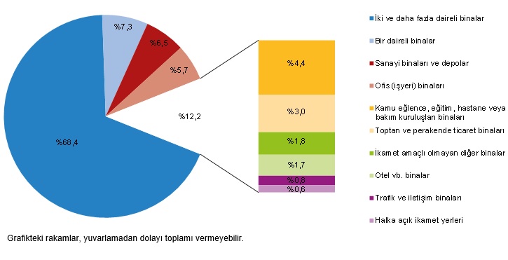En yüksek yüzölçüm payı %68,4 ile iki ve daha fazla daireli binaların oldu