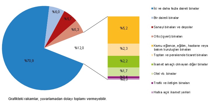 En yüksek yüzölçüm payı %70,9 ile iki ve daha fazla daireli binaların oldu