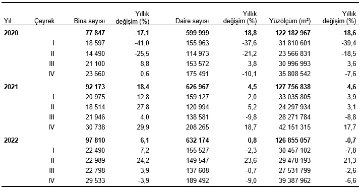 Bir önceki yılın aynı çeyreğine göre, 2022 yılı IV. çeyreğinde belediyeler tarafından yapı ruhsatı verilen yapıların bina sayısı %11,3, daire sayısı %2,1 ve yüzölçümü %7,1 azaldı.