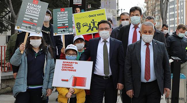Vali Gökmen Çiçek, protokol üyeleri ve öğrenciler ellerinde yaya önceliği konusunda çeşitli sloganların yer aldığı dövizlerle cadde boyunca bir süre yürüyüş gerçekleştirdi.