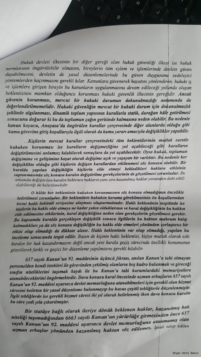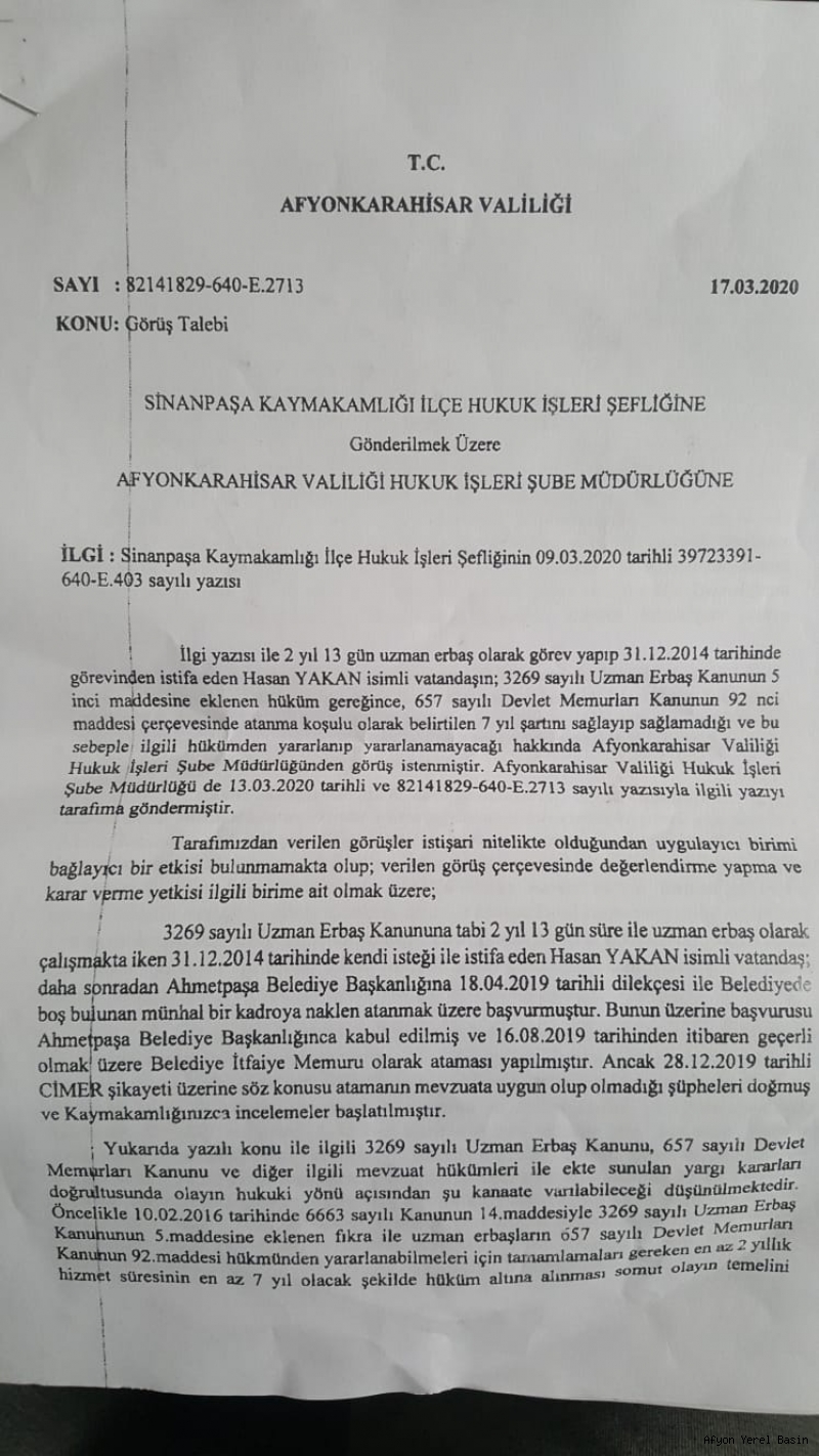 Konu üzerine yapılan ihbar ve şikayet üzertine Afyonkarahisar Valiliği Hukuk işleri inceleme başlatmış, Yapılan inceleme sonrası Uzman Erbaşların 657 Sayılı Devlet Memurları Kanununun 92. maddesi hükmünden yararlanabilmeleri için tamamlamaları gereken en az 2 yıllık hizmet süresinin, en az 7 yıl olacak şekilde hükmün altına alınması somut olayın temelini oluşturmaktadır; denildi.