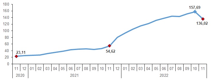 2022 yılı Kasım ayında Yİ-ÜFE (2003=100) bir önceki aya göre %0,74, bir önceki yılın Aralık ayına göre %98,20, bir önceki yılın aynı ayına göre %136,02 ve on iki aylık ortalamalara göre %128,94 artış gösterdi.