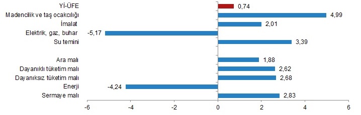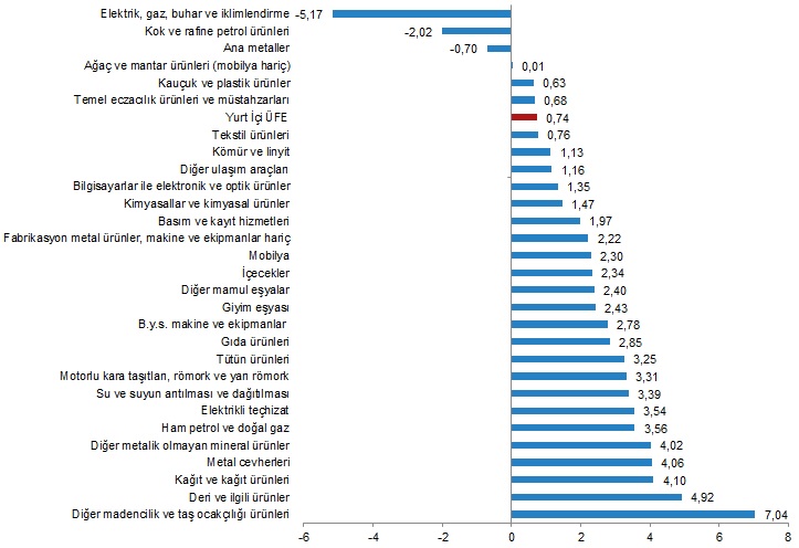 Aylık en yüksek azalış; %5,17 ile elektrik, gaz, buhar ve iklimlendirme, %2,02 ile kok ve rafine petrol ürünleri, %0,70 ile ana metaller alt sektörlerinde gerçekleşti. Buna karşılık diğer madencilik ve taş ocakçılığı ürünleri %7,04, deri ve ilgili ürünler %4,92, kağıt ve kağıt ürünleri %4,10 ile endekslerin en fazla arttığı alt sektörler oldu.