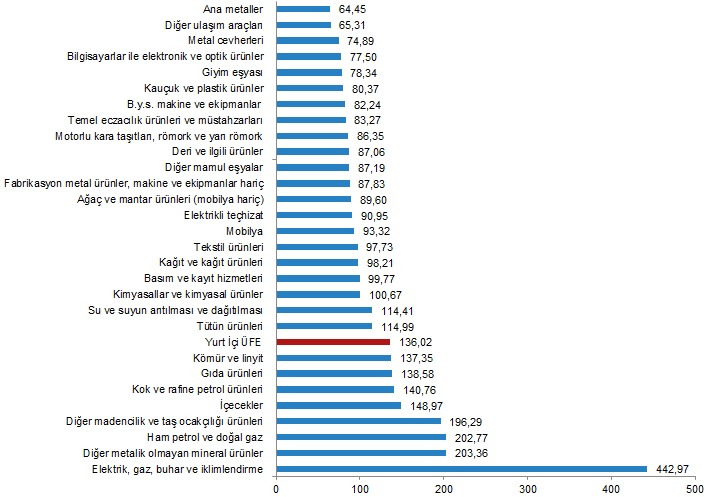 Yıllık en düşük artış; %64,45 ile ana metaller, %65,31 ile diğer ulaşım araçları, %74,89 ile metal cevherleri alt sektörlerinde gerçekleşti. Buna karşılık elektrik, gaz, buhar ve iklimlendirme %442,97, diğer metalik olmayan mineral ürünler %203,36, ham petrol ve doğal gaz %202,77 ile endekslerin en fazla arttığı alt sektörler oldu.