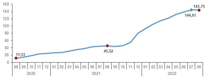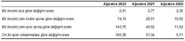 Yİ-ÜFE (2003=100) 2022 yılı Ağustos ayında bir önceki aya göre %2,41, bir önceki yılın Aralık ayına göre %74,13, bir önceki yılın aynı ayına göre %143,75 ve on iki aylık ortalamalara göre %105,39 artış gösterdi.