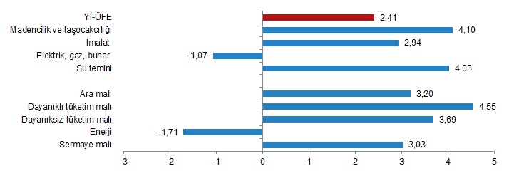Ana sanayi gruplarının aylık değişimleri; ara malında %3,20 artış, dayanıklı tüketim malında %4,55 artış, dayanıksız tüketim malında %3,69 artış, enerjide %1,71 azalış ve sermaye malında %3,03 artış olarak gerçekleşti.