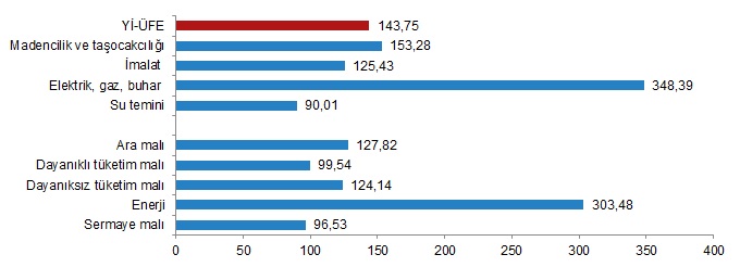 Ana sanayi gruplarının yıllık değişimleri; ara malında %127,82, dayanıklı tüketim malında %99,54, dayanıksız tüketim malında %124,14, enerjide %303,48 ve sermaye malında %96,53 artış olarak gerçekleşti.