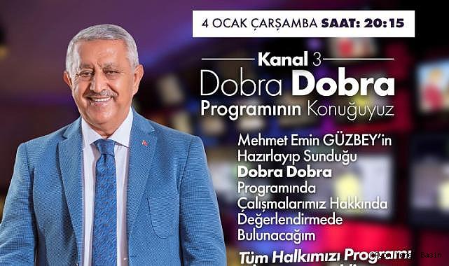 Belediye Başkanı Mehmet Zeybek şehrin televizyon kanalı Kanal 3 TV'ye konuk olacak. Mehmet Emin Güzbey'in hazırlayıp sunduğu Dobra Dobra programına katılacak Zeybek Başkan, merak edilenleri yanıtlayacak, yapılan yatırım ve projeleri anlatacak.Belediye Başkanımız Mehmet Zeybek Kanal 3 TV'ye canlı yayın konuğu oluyor. 4 Ocak Çarşamba günü saat 20.15'da başlayacak programda Başkanımız Mehmet Zeybek 2022 yılında biten, yapımı devam eden ve yeni yılda yapılması planlanan projelere ilişkin değerlendirmelerde bulunacak.Hizmet ve gönül Belediyeciliği şiarı ile gelişen değişen ve büyüyen şehir Afyonkarahisar'ın konuşulacağı program Belediyemizin sosyal medya hesapları ile Kanal 3 TV sosyal medya hesaplarından ortak yayın ile canlı olarak Afyonkarahisar halkıyla buluşacak.Zeybek Başkan sosyal medya hesaplarından yaptığı açıklamada ise; "Dobra Dobra Programının Konuğuyuz. Tüm Halkımızı Programı İzlemeye Davet Ediyorum" dedi.