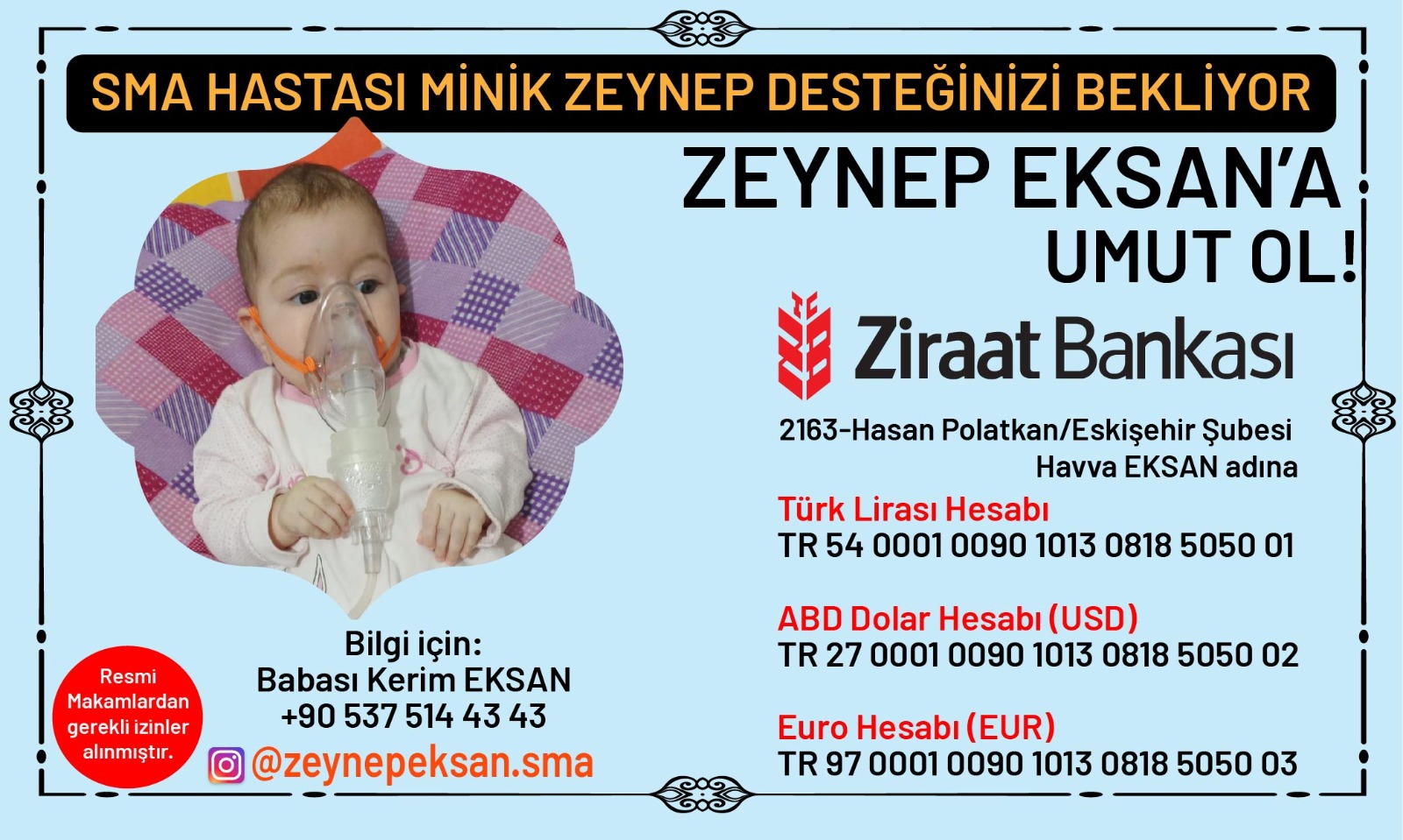 Bir kaç ay önce Osman Gazi Üniversitesi Tıp Fakültesi tarafından SMA Tip 1 (Spinal Muskuler Atrofi) teşhisi konulan Zeynep bebeğin hayata tutunabilmesi için yurt dışında tedavi olması gerekiyor. Zeynep yurt dışında tedavi olabilmesi için ise 26 Milyon TL’ye ihtiyacı var. SMA hastası minik Zeynep’in ailesi parayı toparlayabilmek ve evlatlarını biran önce tedavi ettirebilmek için resmi izinli yardım kampanyası başlattı. Aile, tüm Türkiye’den yardım bekliyor.